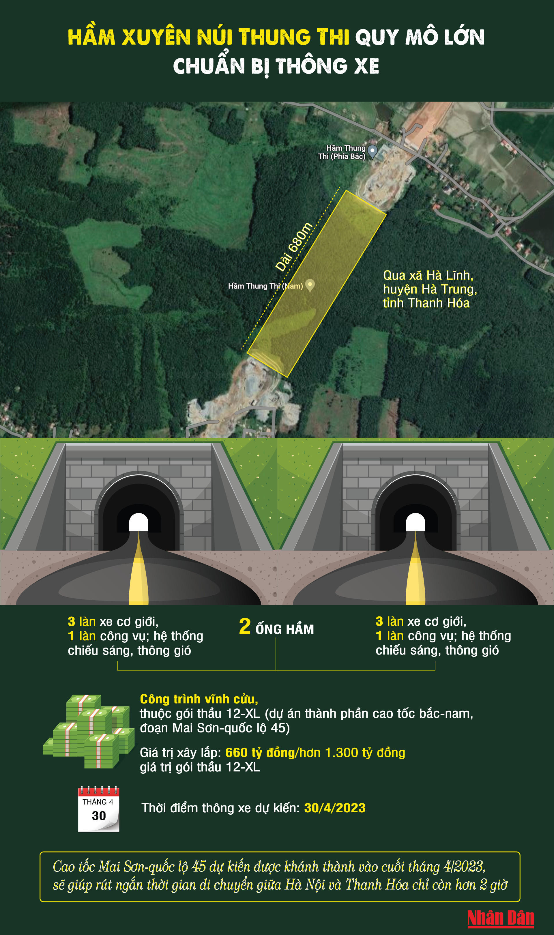 Tập đoàn Đèo Cả, ngày 21/4, cho biết, hầm xuyên núi Thung Thi, công trình hầm quy mô lớn trên đoạn tuyến cao tốc Mai Sơn-quốc lộ 45 đang được hoàn thiện các hạng mục cuối để bàn giao cho chủ đầu tư, sẵn sàng thông xe, đưa vào khai thác dịp 30/4/2023.