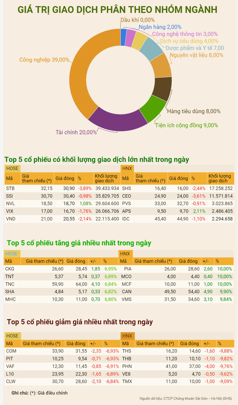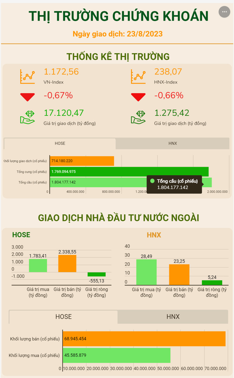Kết phiên giao dịch ngày 23/8, VN-Index giảm 7,93 điểm (-0,67%) về mức 1.172,56 điểm, HNX-Index giảm 1,58 điểm (-0,66%) về 238,07 điểm. Thanh khoản trên hai sàn niêm yết chỉ đạt 18.390,09 tỷ đồng được giao dịch, giảm mạnh 22,71% so với phiên trước, dưới mức mức trung bình của thị trường, khối lượng giao dịch của VN-Index thấp nhất từ 5/7/2023 trở lại đây. Nhà đầu tư nước ngoài tiếp tục bán ròng khá mạnh trên HOSE với giá trị 555,13 tỷ đồng, mua ròng trên HNX với giá trị 5,24 tỷ đồng.