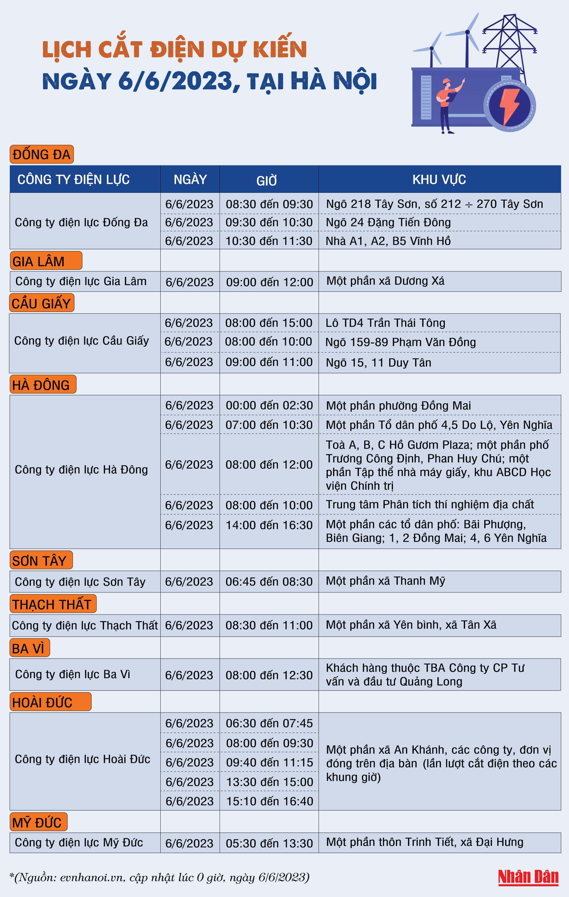 [Infographic] Lịch cắt điện dự kiến ngày 6/6/2023, tại Hà Nội