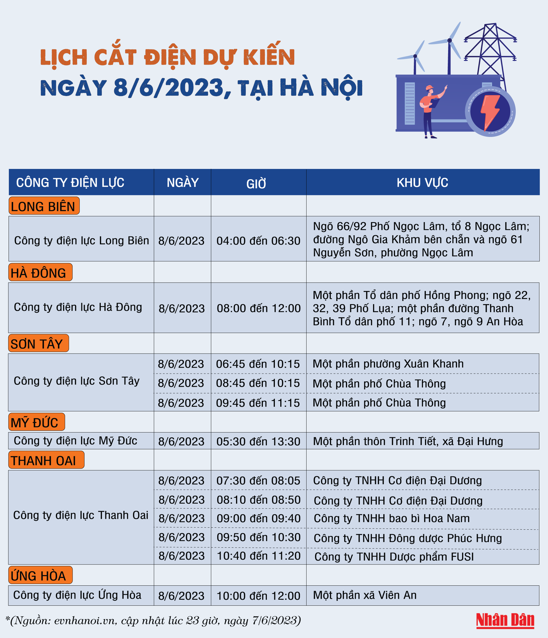 [Infographic] Lịch cắt điện dự kiến ngày 8/6/2023 tại Hà Nội