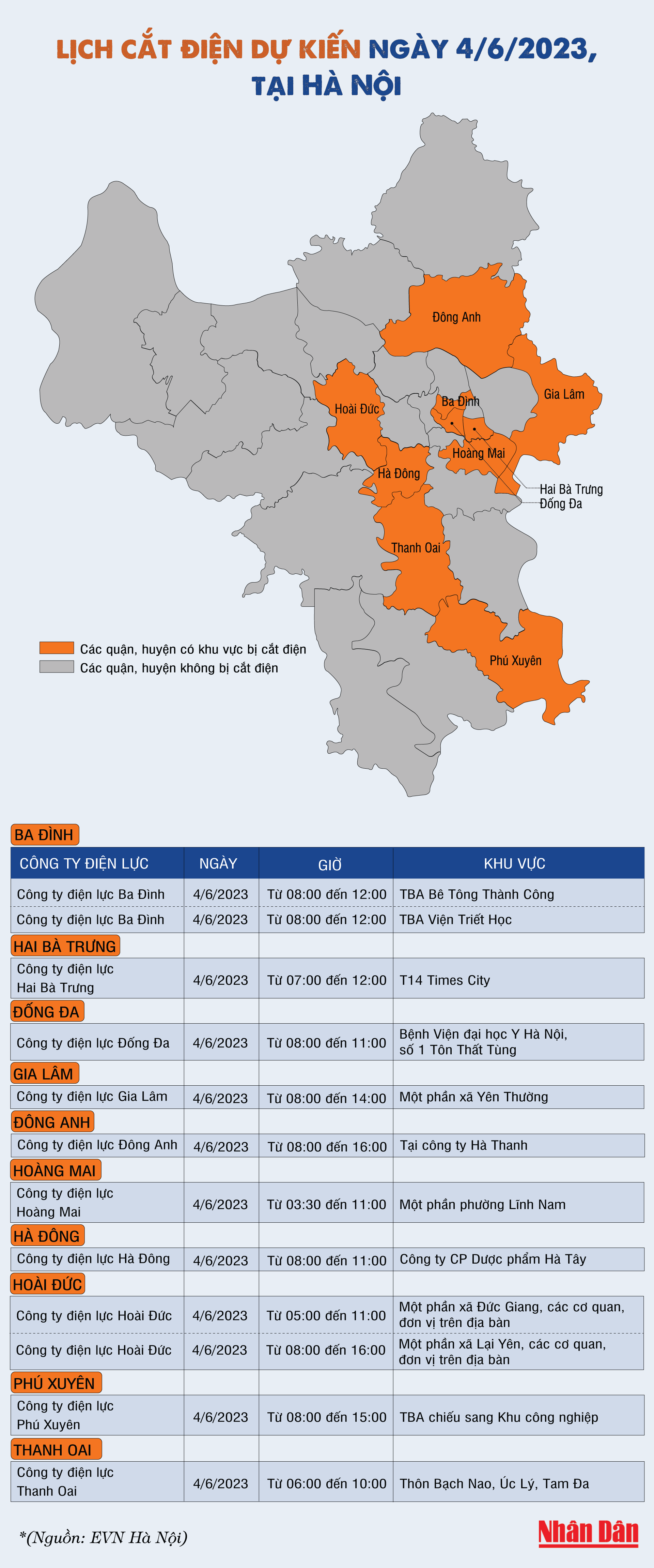 [Infographic] Lịch cắt điện ngày 4/6/2023 tại Hà Nội