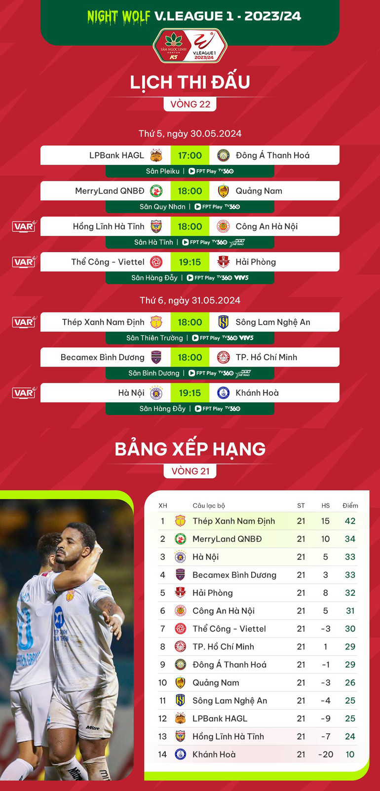 [Infographic] Lịch thi đấu vòng 22 V-League: Thép Xanh Nam Định đối đầu Sông Lam Nghệ An