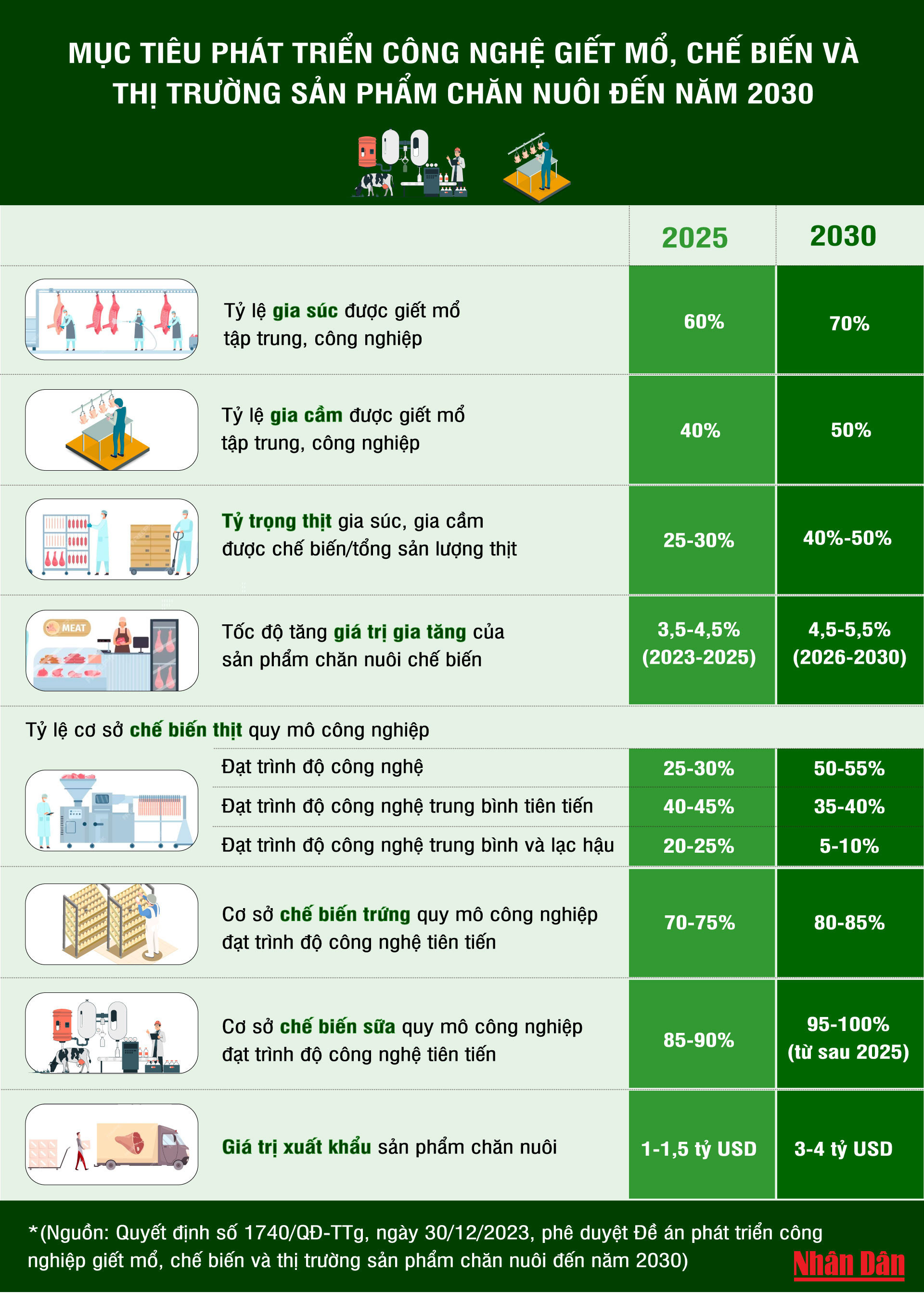 Mục tiêu của Đề án nhằm nâng cao năng lực giết mổ, chế biến, đa dạng hóa sản phẩm chăn nuôi, bảo đảm an toàn thực phẩm, an toàn dịch bệnh, chất lượng và giá trị gia tăng của sản phẩm chăn nuôi; đẩy mạnh xúc tiến thương mại, mở rộng thị trường sản phẩm chăn nuôi trong nước và xuất khẩu.