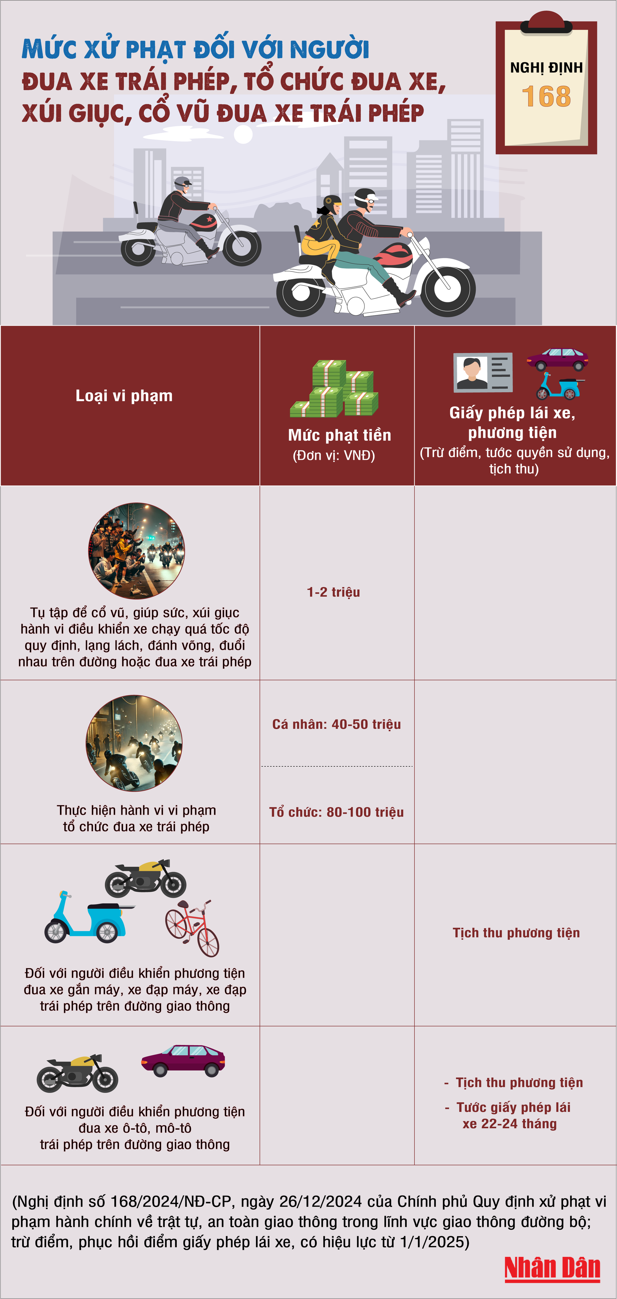 [Infographic] Nghị định 168: Mức xử phạt đối với người đua xe trái phép, tổ chức, cổ vũ đua xe trái phép