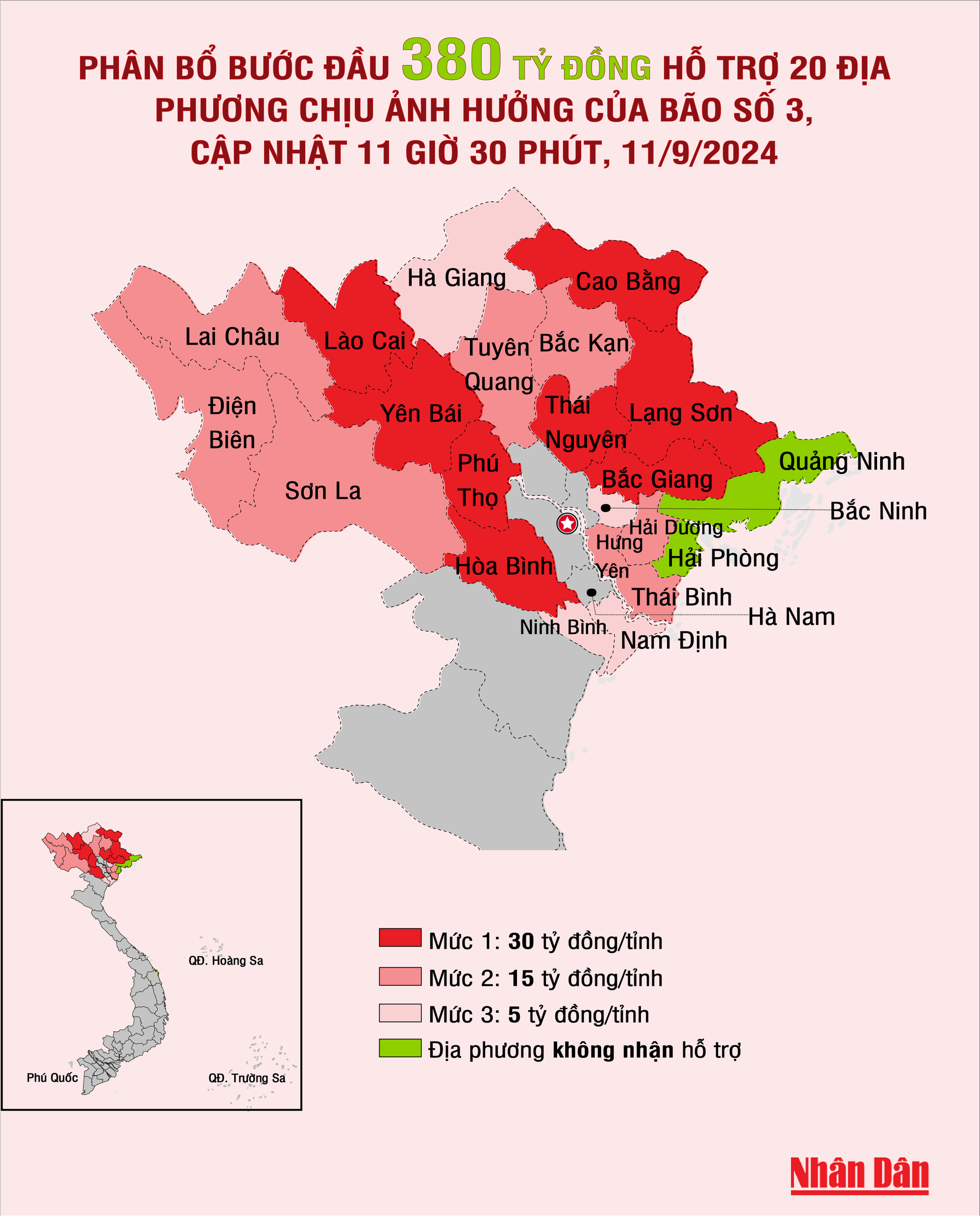 [Infographic] Phân bổ bước đầu 380 tỷ đồng hỗ trợ 20 địa phương chịu ảnh hưởng của bão số 3