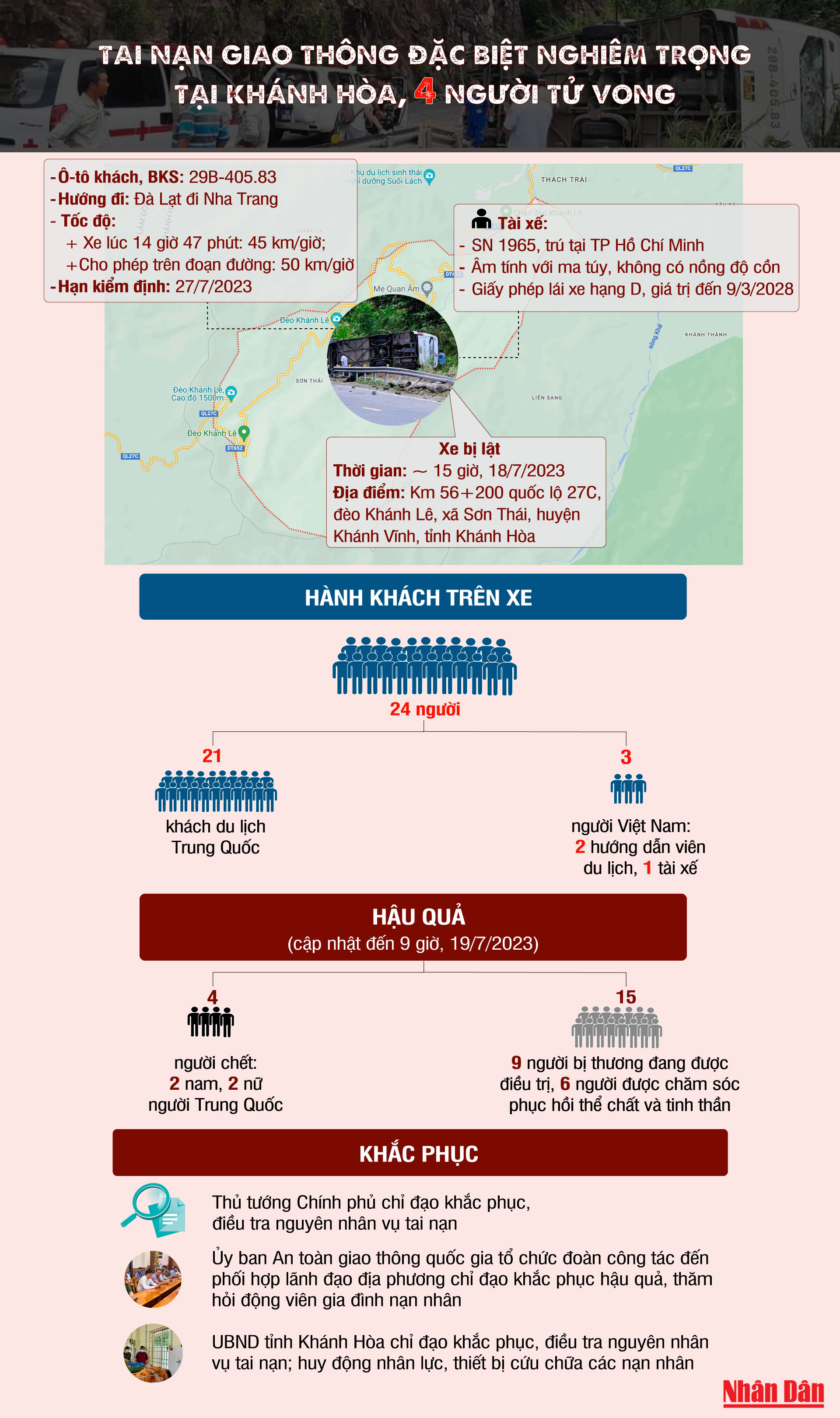 Theo Ủy ban An toàn giao thông quốc gia, tính đến 9 giờ sáng 19/7, vụ tai nạn giao thông đặc biệt nghiêm trọng trên quốc lộ 27C, đoạn qua đèo Khánh Lê, thuộc địa bàn xã Sơn Thái, huyện Khánh Vĩnh, tỉnh Khánh Hòa làm 4 người chết; 15 người đang được chăm sóc y tế, trong đó có 9 người bị thương đang được điều trị và 6 người đang được chăm sóc phục hồi thể chất và tinh thần.