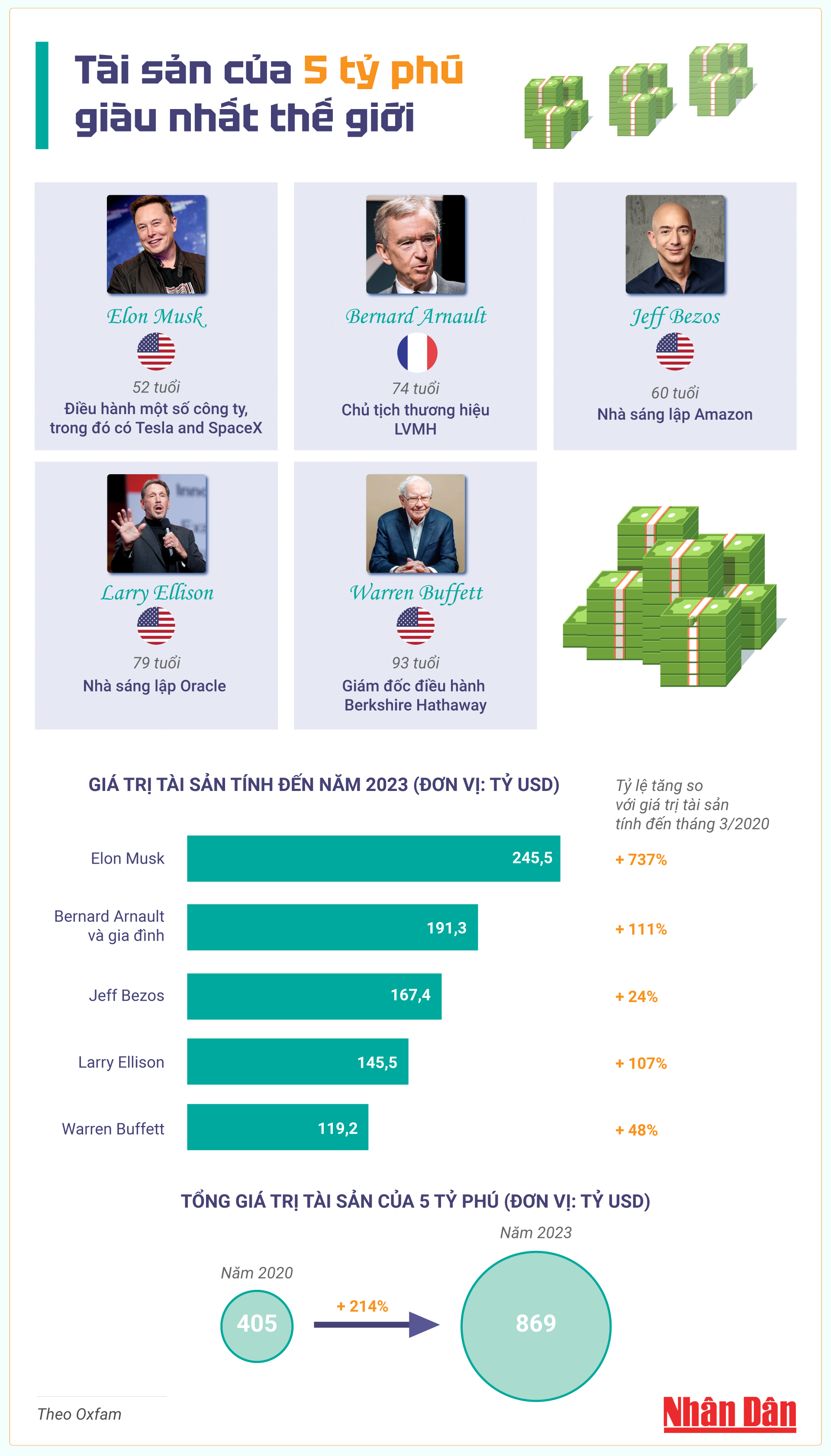 Tổ chức quốc tế Oxfam cho biết tổng giá trị tài sản của 5 tỷ phú giàu nhất thế giới đã tăng gấp 2 lần trong 3 năm qua.