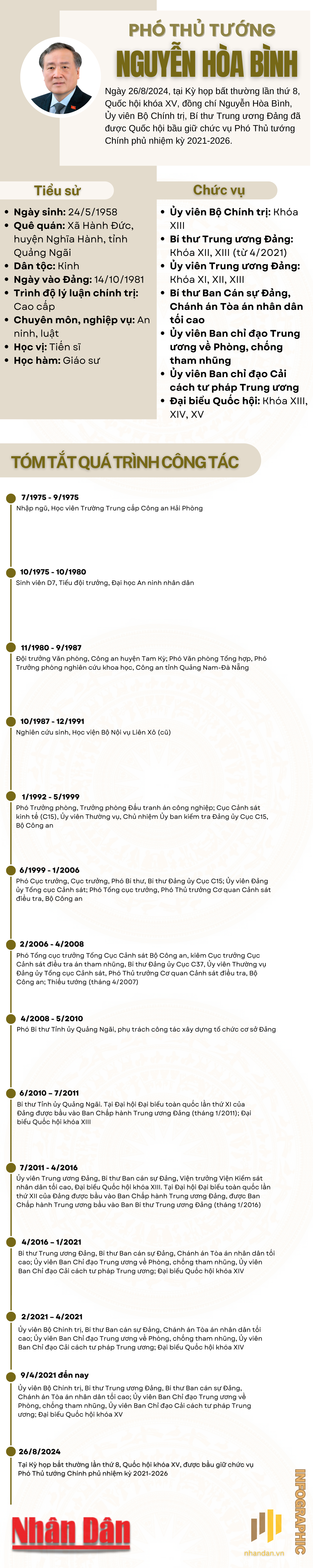 Ngày 26/8/2024, tại Kỳ họp bất thường lần thứ 8, Quốc hội khóa XV, đồng chí Nguyễn Hòa Bình, Ủy viên Bộ Chính trị, Bí thư Trung ương Đảng đã được Quốc hội bầu giữ chức vụ Phó Thủ tướng Chính phủ nhiệm kỳ 2021-2026.