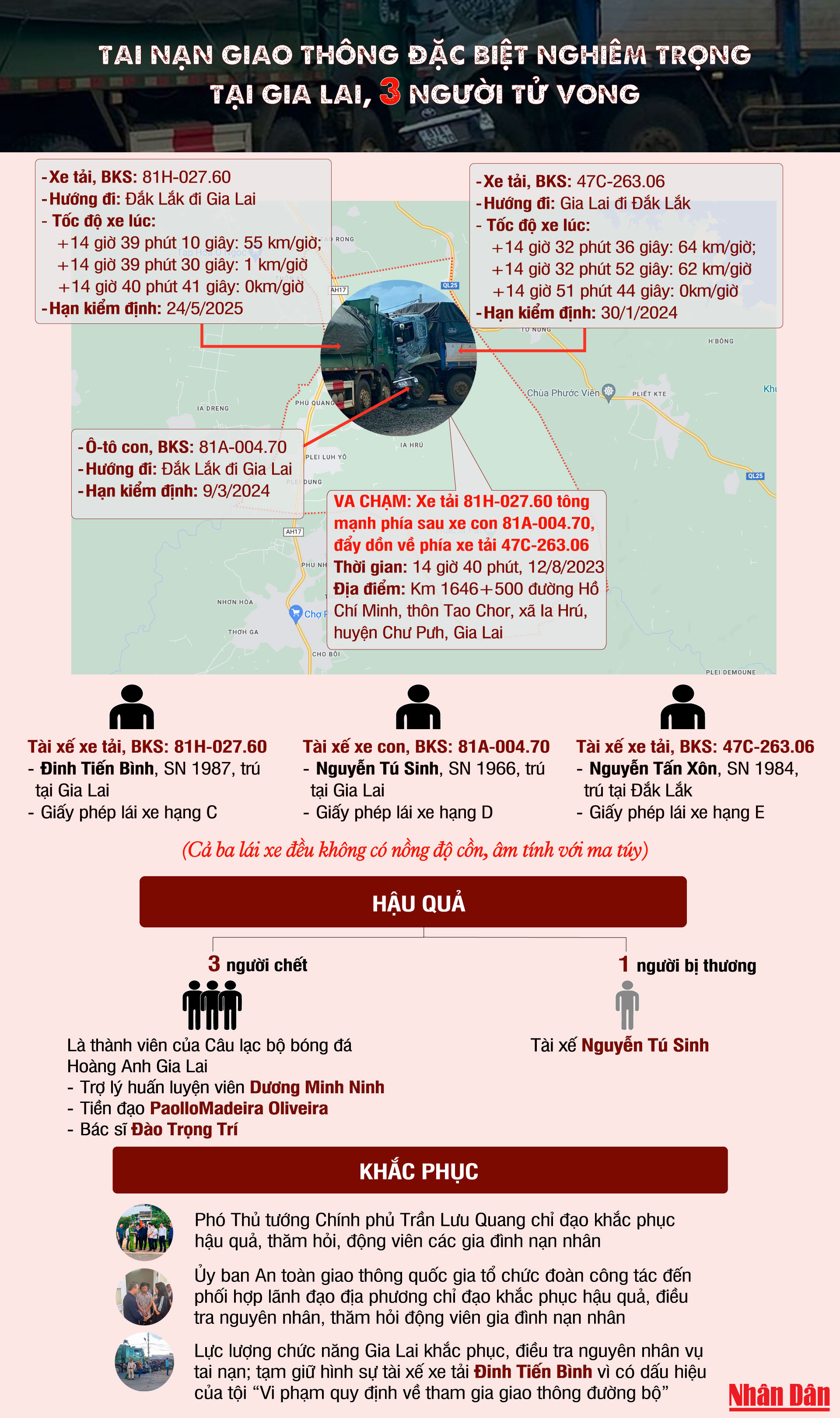 Vụ tai nạn giao thông đặc biệt nghiêm trọng chiều 12/8, tại Gia Lai làm 3 thành viên Câu lạc bộ bóng đá Hoàng Anh Gia Lai thiệt mạng và 1 người bị thương. Ngày 13/8, Cơ quan Cảnh sát điều tra (Công an tỉnh Gia Lai) đã ra quyết định tạm giữ hình sự đối với tài xế xe tải BKS 81H-027.60 Đinh Tiến Bình do có dấu hiệu của tội "Vi phạm quy định về tham gia giao thông đường bộ".