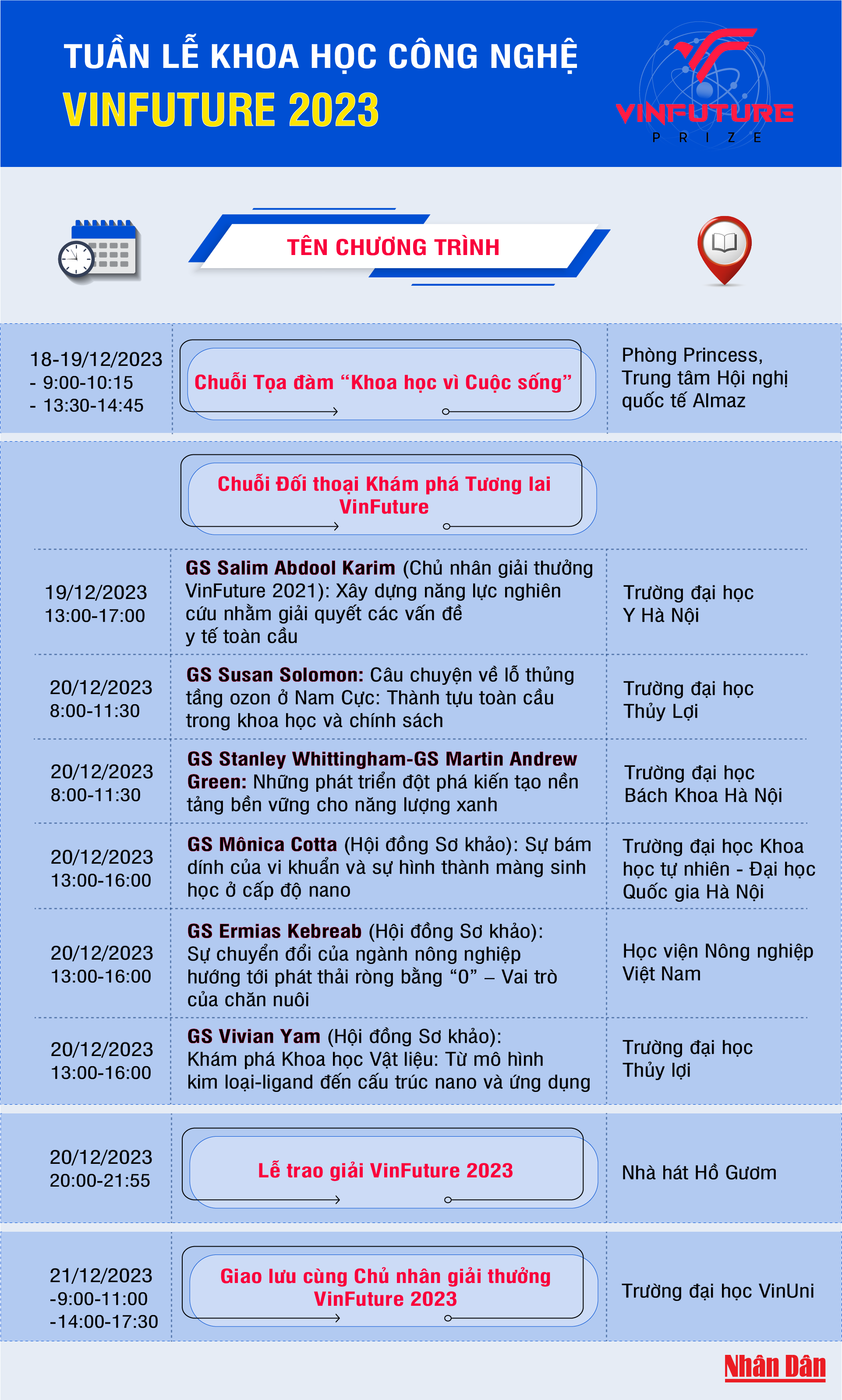Tuần lễ Khoa học công nghệ VinFuture 2023 với nhiều hoạt động diễn ra trong các ngày từ 18 đến 21/12/2023.