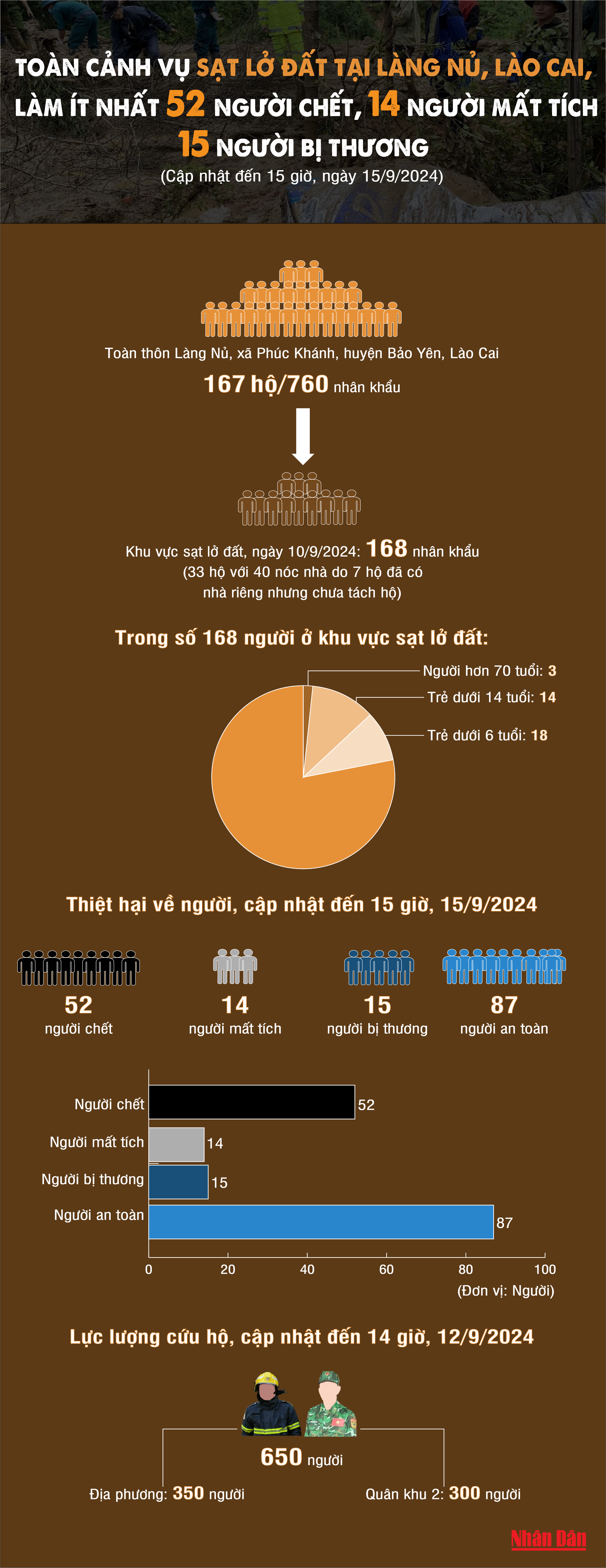 Như vậy, cho đến thời điểm hiện tại, tổng số người chết và mất tích tại Làng Nủ đến nay còn 66 trường hợp, giảm 29 trường hợp so với số liệu công bố ban đầu. Trong đó, có 52 người chết, 14 người mất tích, 87 người đã được xác định an toàn, trong khi 15 người bị thương đang được điều trị tại bệnh viện.