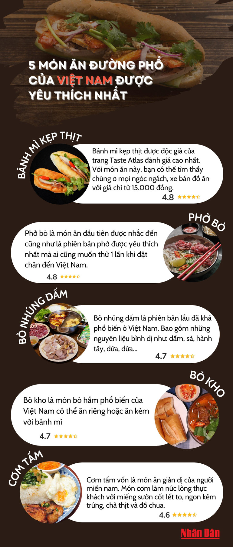Tính đến ngày 16/8, bánh mì kẹp thịt của Việt Nam được độc giả trên trang ẩm thực Taste Atlas đánh giá yêu thích nhất, với 4,8 sao. Ngoài ra, các món ăn khác như: phở, bò kho, bò nhúng dấm, bánh mì nói chung cũng nằm trong tốp 5 món ăn được bình chọn cao.