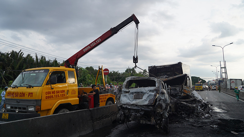 Chiếc xe tải bị lửa thiêu rụi phần ca bin sau va chạm.