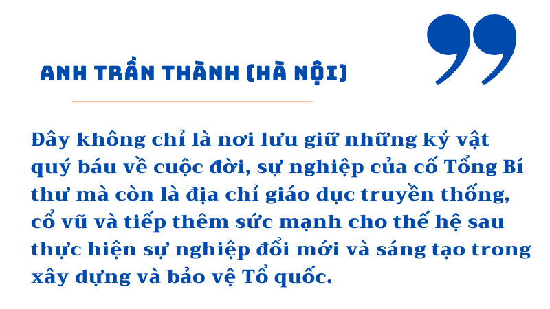 Anh Trần Thành (Hà Nội), một khách trong đoàn tới thăm khu di tích chia sẻ: “Mặc dù sinh ra và lớn lên tại Hà Nội, nhưng tôi đã được nghe nhiều chuyện kể về Tổng Bí thư Nguyễn Văn Linh qua sách, báo. Hôm nay, khi được đến thăm khu lưu niệm thì càng thêm tự hào và biết ơn. Đây không chỉ là nơi lưu giữ những kỷ vật quý báu về cuộc đời, sự nghiệp của cố Tổng Bí thư mà còn là địa chỉ giáo dục truyền thống, cổ vũ và tiếp thêm sức mạnh cho thế hệ sau thực hiện sự nghiệp đổi mới và sáng tạo trong xây dựng và bảo vệ Tổ quốc”.