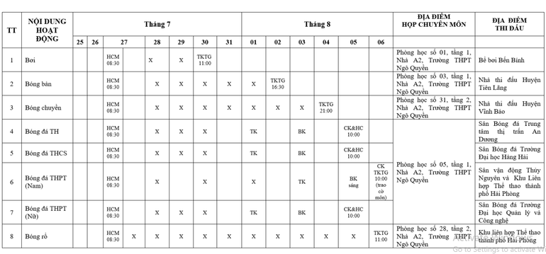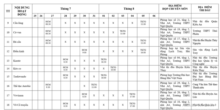 Trong đó, các từ viết tắt được hiểu như sau: HMC là họp chuyên môn; X là thời gian thi đấu; CK&HC: Chung kết và Trao huy chương; TKTG là Tổng kết trao giải; CK là chung kết.