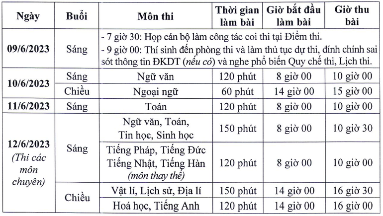 Lịch thi chi tiết các buổi thi, giờ làm bài các môn thi kỳ thi tuyển sinh vào lớp 10 năm học 2023-2024 của thành phố Hà Nội: