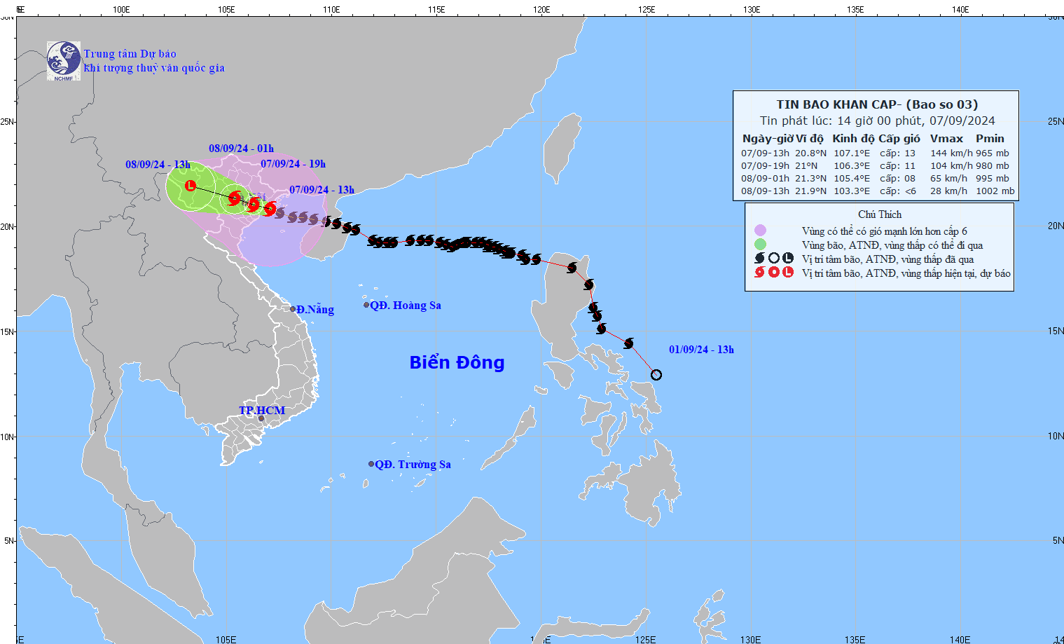 Hồi 4 giờ ngày 7/9, vị trí tâm bão số 3 ở vào khoảng 20,4 độ Vĩ Bắc; 108,7 độ Kinh Đông, trên vùng biển vịnh Bắc Bộ; cách Móng Cái (Quảng Ninh) khoảng 180km về phía Đông Nam, cách Quảng Ninh-Hải Phòng khoảng 220km về phía Đông Đông Nam. Sức gió mạnh nhất vùng gần tâm bão mạnh cấp 14 (150-166km/giờ), giật cấp 17, di chuyển theo hướng Tây Tây Bắc, tốc độ 15-20km/giờ.