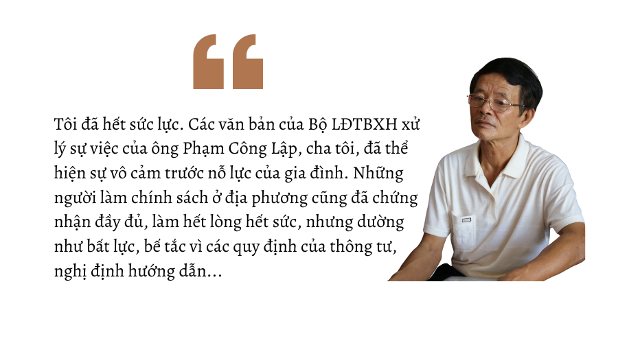 Nhận được hồi âm muốn hoàn thành hồ sơ công nhận liệt sĩ cho cha mình, phải làm theo một loạt nghị định, thông tư được hướng dẫn trên, anh Phạm Công Đức chán nản: “Tôi đã hết sức lực. Các văn bản của Bộ LĐ-TBXH xử lý sự việc của ông Phạm Công Lập, cha tôi, đã thể hiện sự vô cảm trước nỗ lực của gia đình. Những người làm chính sách ở địa phương cũng đã chứng nhận đầy đủ, làm hết lòng hết sức, nhưng dường như bất lực, bế tắc vì các quy định của thông tư, nghị định hướng dẫn”.