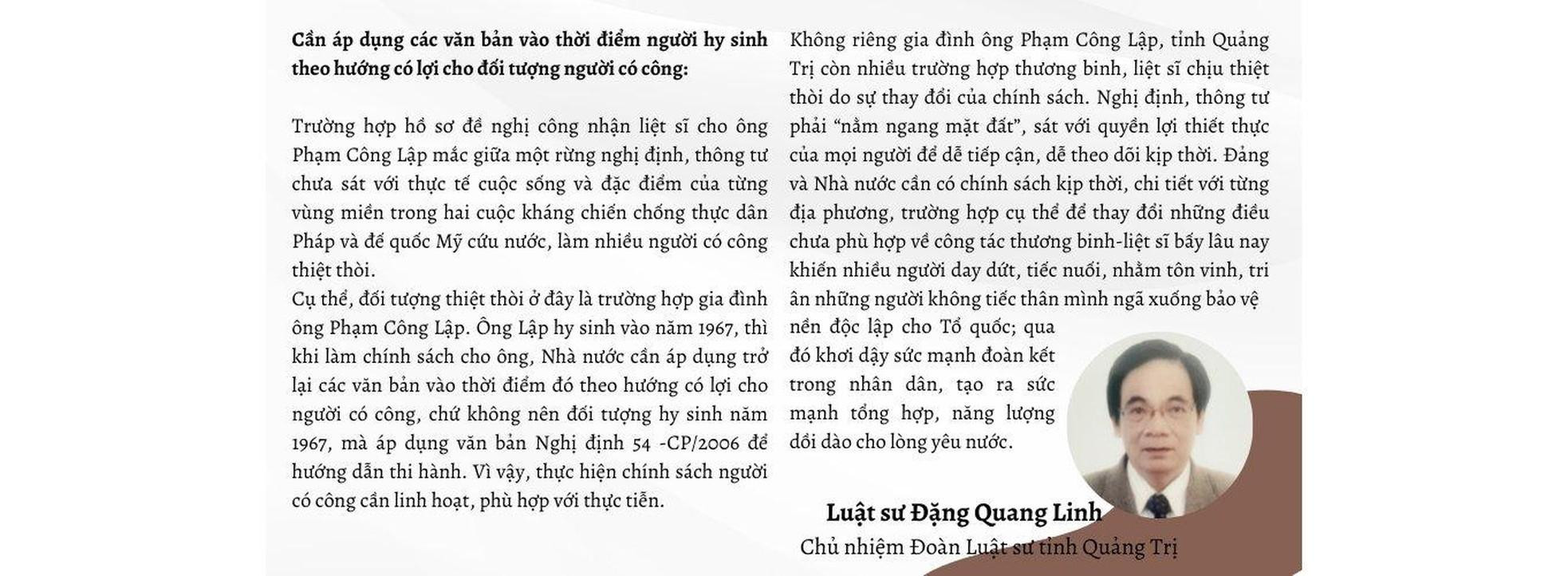 Trước tình hình này, Sở Lao động-Thương binh và Xã hội tỉnh Quảng Trị đã đề nghị Sở Nông nghiệp và Phát triển nông thôn Quảng Trị hướng dẫn thân nhân ông Phạm Công Lập lập hồ sơ theo quy định tại Nghị định số 31/2013/NĐ-CP ngày 9/4/2013 của Chính phủ; Thông tư số 05/2013/TT-BLĐTBXH; Thông tư 28/2013/TTLT-BLĐTBXH-BQP ngày 22/10/2013 của Bộ Lao động-Thương binh và Xã hội và Bộ Quốc phòng.