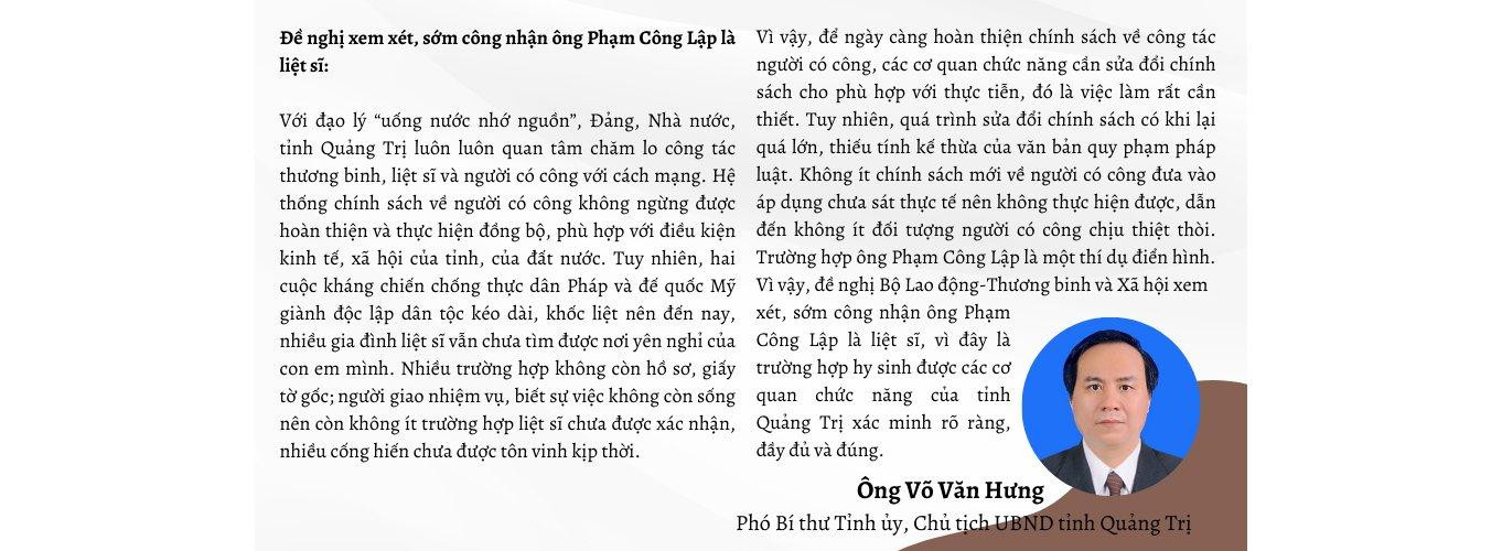 Cùng Giấy báo tử của Sở Nông nghiệp và Phát triển nông thôn Quảng Trị cấp, Sở Lao động-Thương binh và Xã hội tỉnh Quảng Trị đã tham mưu cho Ủy ban nhân dân tỉnh Quảng Trị Công văn số 1403/UBND-VX, ngày 20/5/2013, đề nghị Bộ Lao động-Thương binh và Xã hội xem xét giải quyết hồ sơ công nhận ông Phạm Công Lập là liệt sĩ, hưởng chính sách tồn đọng theo thủ tục hồ sơ do hai người làm chứng.