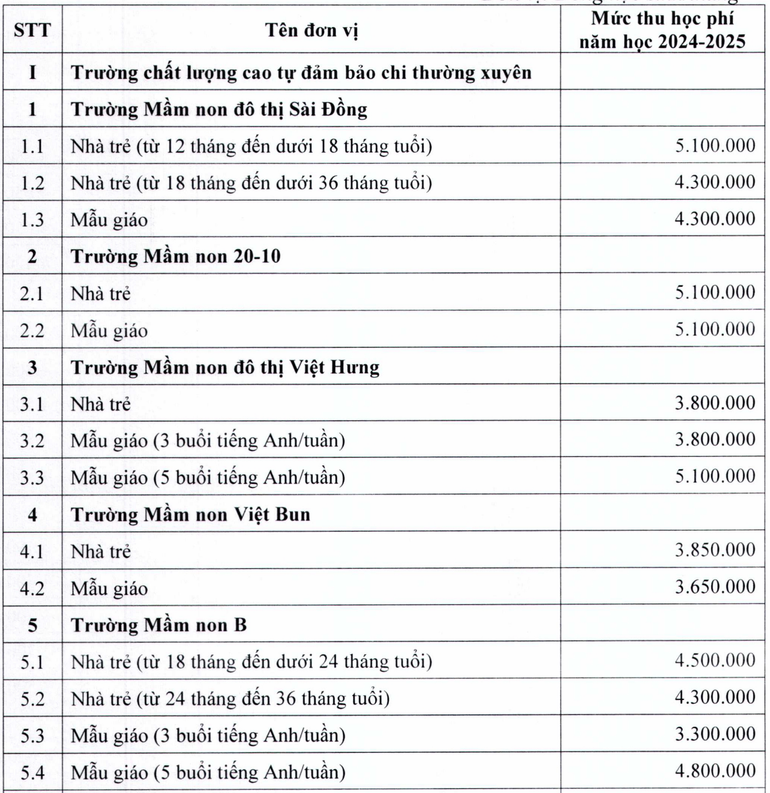 Mức thu học phí đối với các cơ sở giáo dục mầm non, giáo dục phổ thông công lập tự bảo đảm chi thường xuyên năm học 2024-2025 cụ thể như sau: