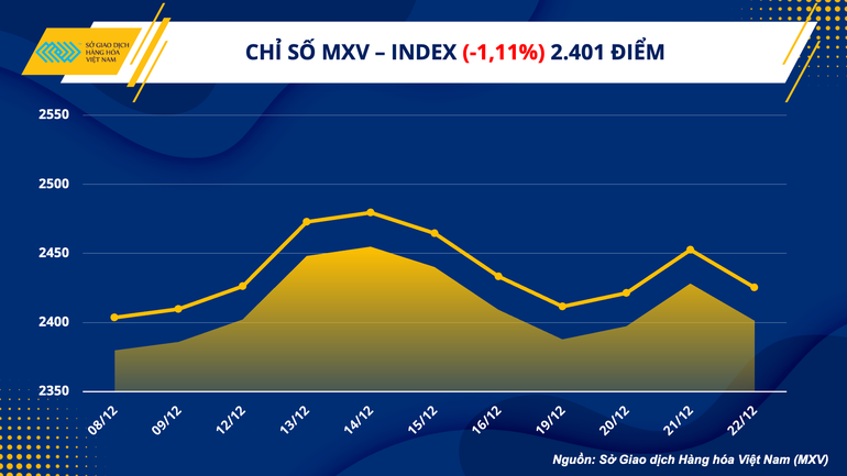 Theo Sở Giao dịch Hàng hóa Việt Nam (MXV), kết thúc ngày hôm qua (22/12), sắc đỏ chiếm ưu thế trên bảng giá của cả 4 nhóm hàng hóa nguyên liệu đang được giao dịch liên thông thế giới tại MXV. 22 trên tổng số 31 mặt hàng đồng loạt giảm giá, trong đó nhiều mặt hàng quan trọng ghi nhận mức giảm rất mạnh đã kéo chỉ số MXV-Index đảo chiều giảm 1,11%, xuống 2.401 điểm. Giá trị giao dịch toàn Sở đạt gần 4.300 tỷ đồng.