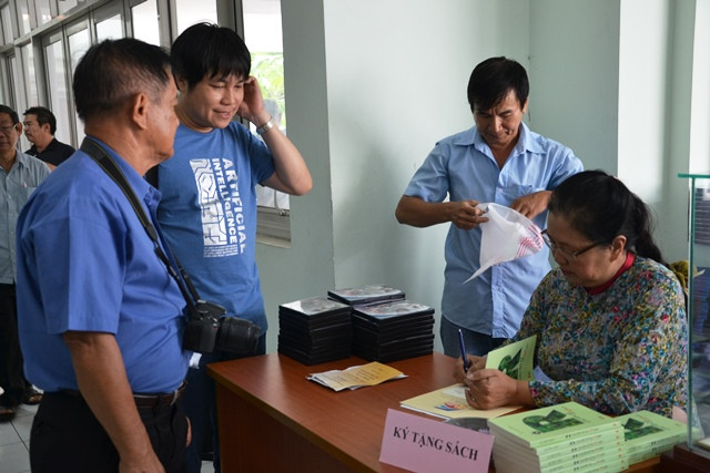 Nhà biên kịch Dương Cẩm Thúy, em út nhà văn Lê Văn Thảo ký tặng sách cho đại biểu trong buổi giới thiệu cuốn sách.
