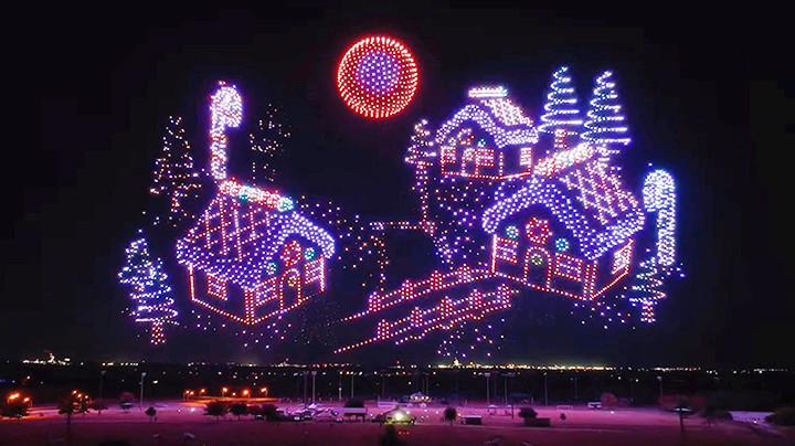 Một chương trình theo chủ đề ngày lễ do công ty biểu diễn Sky Elements có trụ sở tại bang Texas (Mỹ) thực hiện, đã sử dụng 4.981 máy bay không người lái để tạo loạt hình ảnh như ngôi nhà (trong ảnh), ông già Noel và người tuyết trên bầu trời thành phố Mansfield. Đây cũng là màn trình diễn trên không lớn nhất bằng UAV.
