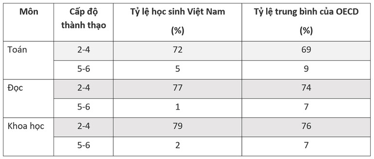 Khoảng 77% học sinh Việt Nam đạt cấp độ 2 trở lên đối với môn đọc, cao hơn mức trung bình 74% của OECD. Đối với môn khoa học, khoảng 79% học sinh đạt từ cấp độ 2 trở lên, cao hơn mức trung bình của OECD (76%).