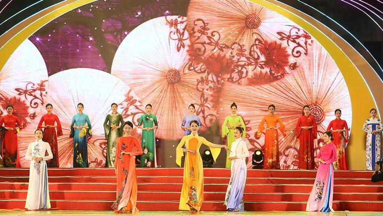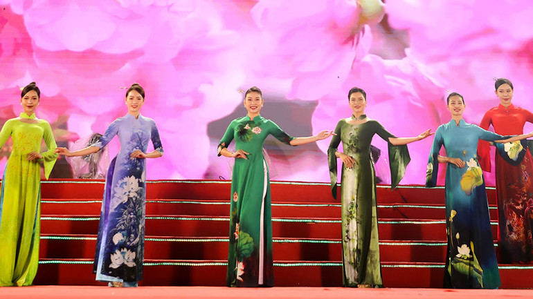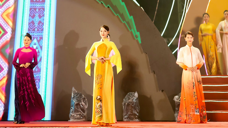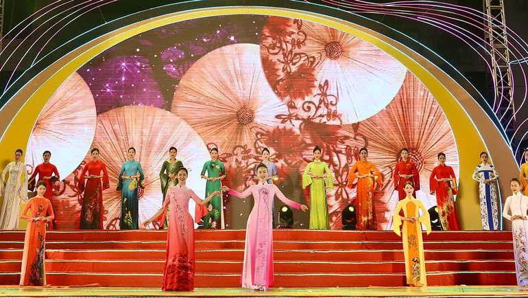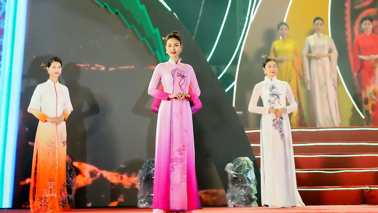 | Nhà thiết kế Vũ Thảo Giang (áo dài xanh) và các đại biểu khách mời tại Lễ hội. |