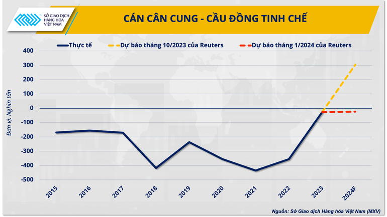 Dự báo mới nhất của hãng tin Reuters cho biết, thị trường đồng tinh chế có thể thâm hụt 24.000 tấn trong năm 2024, trái với dự báo thặng dư 302.500 tấn trong khảo sát tháng 10/2023 là thời điểm mỏ Cobre chưa bị đóng cửa. Ngoài ra, mức thâm hụt cũng được dự báo sẽ tăng lên 115.000 tấn vào năm 2025.