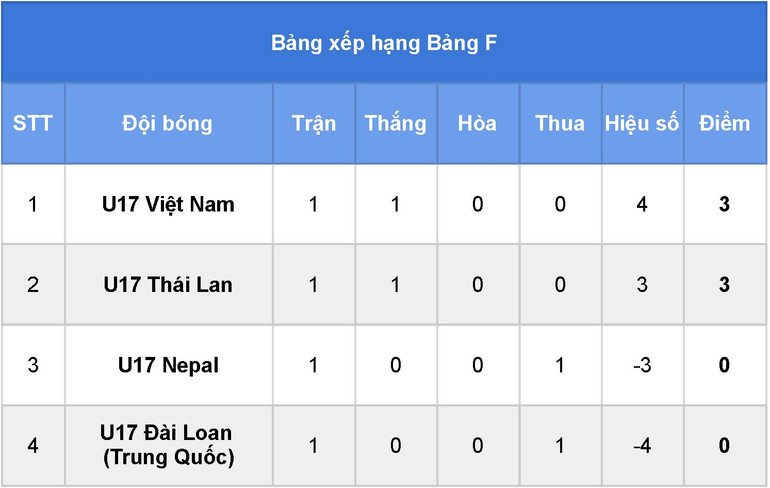 Đại thắng U17 Đài Loan, thầy trò huấn luyện viên Nguyễn Quốc Tuấn vươn lên vị trí đầu bảng F và xếp trên U17 Thái Lan do hơn hiệu số. Sau trận đấu này, U17 Việt Nam sẽ đối đầu U17 Nepal vào lúc 19 giờ ngày 7/10.