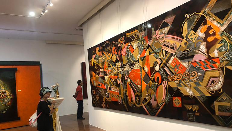 Những bức tranh có tên “Trừu tượng” chiếm số lượng khá lớn ở triển lãm, họa sĩ đã sử dụng rất nhiều chất liệu dân gian như các hình trang trí thổ cẩm, các họa tiết sóng, mây, rồng uốn lượn cách điệu, cùng với sắc màu rực rỡ của son, vàng, vỏ trứng, khảm trai… tạo nên những ấn tượng thật độc đáo.