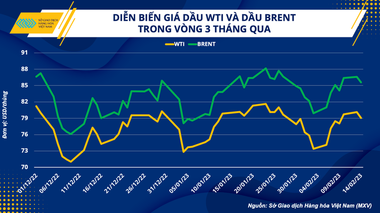 Kết thúc phiên 14/2, giá dầu WTI giảm 1,35% xuống 79,06 USD/thùng và dầu Brent giảm 1,19% về mức 85,58 USD/thùng. Cả hai mặt hàng dầu thô đều đang đi ngang trong biên độ rộng kể từ đầu tháng 12 tới nay, với giá dầu WTI đã giằng co từ 70-73 USD, còn giá dầu thô Brent có khoảng giao dịch từ 75-89 USD.