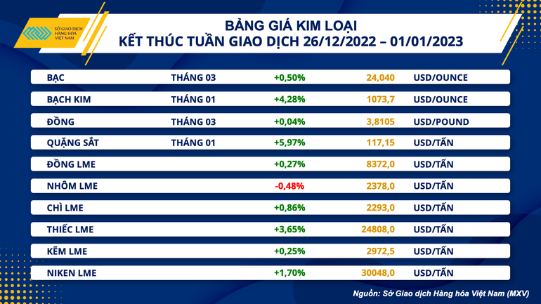 Đối với nhóm kim loại cơ bản, quặng sắt dẫn đầu đà tăng với mức tăng gần 6% lên mức 117,5 USD/tấn, trong khi giá đồng trải qua một tuần biến động khá khó đoán, kết thúc với mức tăng rất nhỏ, chỉ 0,04% lên 3,81 USD/pound. Các tin tức liên quan tới Trung Quốc đều có ảnh hưởng tới cả hai mặt hàng kim loại này, tuy nhiên thị trường đang kỳ vọng vào sự phục hồi nhanh chóng hơn ở thị trường quặng sắt, đã giúp cho giá mặt hàng này tăng lên mức cao nhất kể từ tháng 8, đánh dấu mức tăng 50% so với mức đáy 78 USD vào tháng 11.