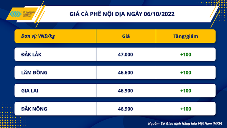 Trên thị trường nội địa, ghi nhận trong sáng nay, giá cà-phê nhân xô tại Tây Nguyên và các tỉnh Nam Bộ đồng loạt tăng nhẹ 100 đồng/kg. Theo đó, giá cà-phê trong nước được thu mua dao động trong khoảng 46.600-47.000 đồng/kg. Như vậy, so với đầu tuần này, giá cà-phê nội địa đã liên tục tăng với mức tổng lên đến 500 đồng/kg.