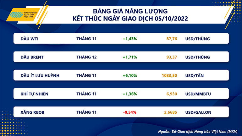 Dầu thô tăng phiên thứ 3 liên tiếp trong tuần, sau quyết định tăng sản lượng của Tổ chức các nước xuất khẩu dầu mỏ và đồng minh (OPEC+) và báo cáo thị trường dầu hàng tuần của EIA cho thấy tồn kho dầu tại Mỹ tiếp tục giảm. Cụ thể, kết thúc phiên giao dịch ngày 5/10, giá WTI tăng 1,43% lên 87,76 USD/thùng trong khi giá Brent tăng 1,71 USD/thùng lên 93,37 USD/thùng.