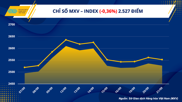 Đóng cửa hôm qua (21/9), lực bán chiếm ưu thế trên thị trường hàng hóa khiến chỉ số MXV-Index quay đầu giảm nhẹ 0,36% xuống mức 2.527 điểm.