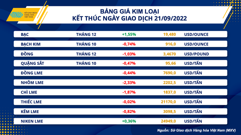 Sau khi liên tục biến động trong phiên, các mặt hàng trong nhóm kim loại kết thúc ngày giao dịch 21/9 với sắc đỏ chiếm ưu thế. Nhóm kim loại quý có sự phân hóa giữa hai mặt hàng bạc và bạch kim. Bạc kết phiên tại mức giá 19,48 USD/ounce, tương đương với mức tăng 1,55%. Trái lại, giá bạch kim ghi nhận đà suy yếu với mức giảm 0,74% xuống mức 916 USD/pound.