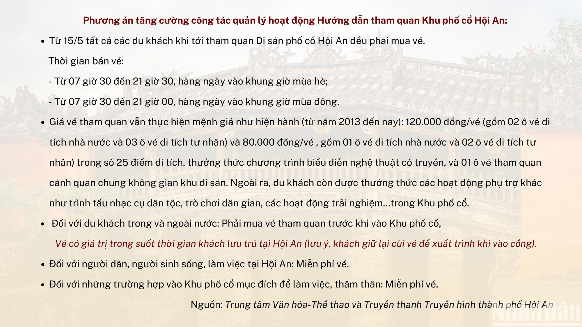 “Từ trước đến nay Hội An vẫn bán vé nhưng ai mua thì mua, không mua thì thôi, cũng không có ai đón tiếp hướng dẫn. Sắp tới chúng tôi sẽ đưa một số hướng dẫn viên ra hướng dẫn cho du khách, mời mua vé. Còn người dân sống trong phố, khách đến vào đó ăn uống thì vẫn đi vào ra bình thường. Chỉ là cố gắng kiểm soát các đoàn khách, vận động doanh nghiệp khi làm sản phẩm du lịch thì có trách nhiệm bảo tồn di sản bằng việc mua vé”, ông Sơn nói rõ.