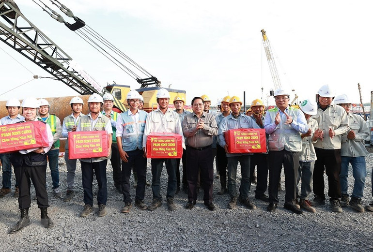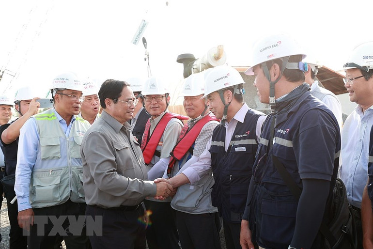 Thủ tướng Phạm Minh Chính với kỹ sư, công nhân thi công cầu Nhơn Trạch. (Ảnh: TTXVN)