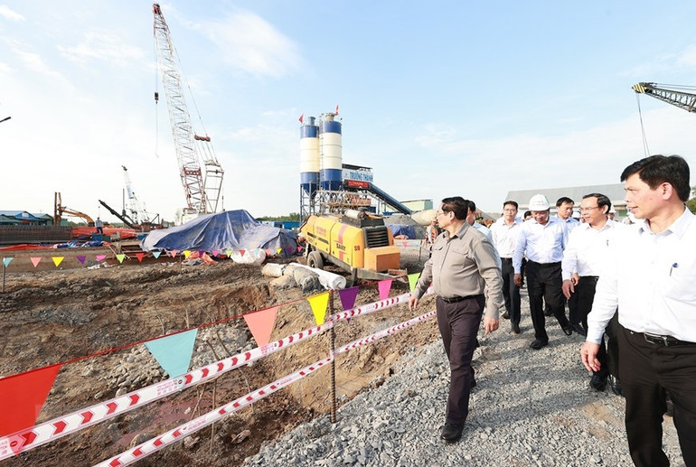 Thủ tướng Phạm Minh Chính kiểm tra tiến độ xây dựng cầu Nhơn Trạch. (Ảnh: TTXVN)