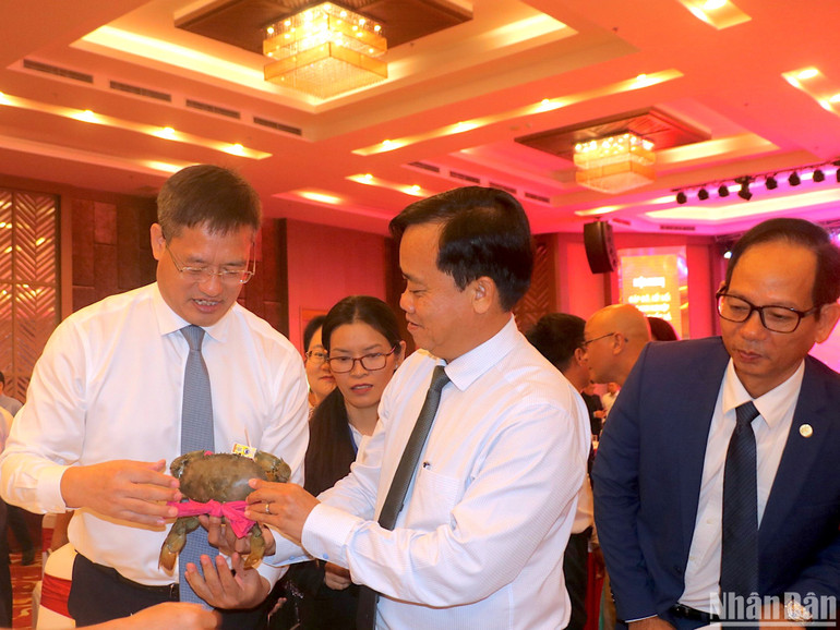 | Chủ tịch Ủy ban nhân dân tỉnh Cà Mau Huỳnh Quốc Việt (giữa) giới thiệu những mặt hàng đặc sản của Cà Mau với doanh nghiệp Trung Quốc. |