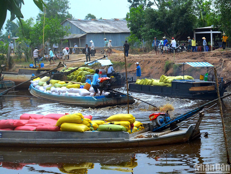 | Thương lái thu mua lúa của nông dân vùng ngọt Cà Mau trong vụ hè thu năm 2023 bằng đường thủy. |