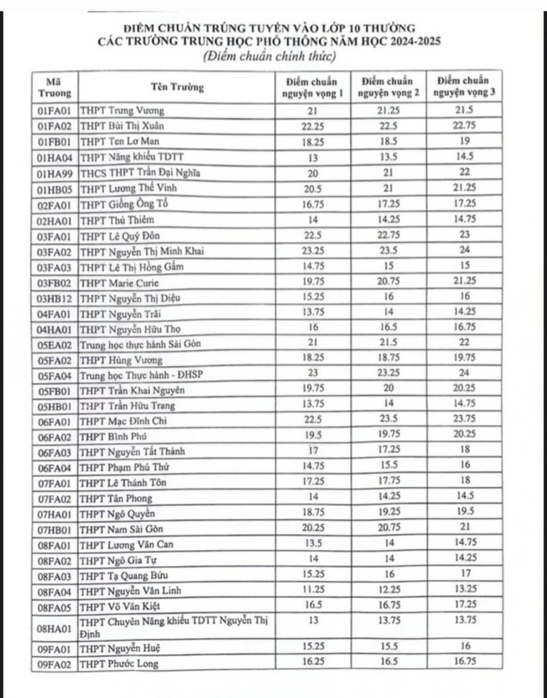 Điểm chuẩn tuyển sinh lớp 10 của các trường trung học phổ thông công lập năm học 2024-2025 như sau: