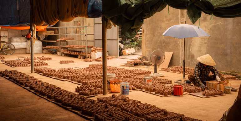 Không khí vương mùi ngai ngái của đất sét, xen lẫn mùi khói bếp, gợi lên ký ức làng quê Bắc Bộ xưa cũ.