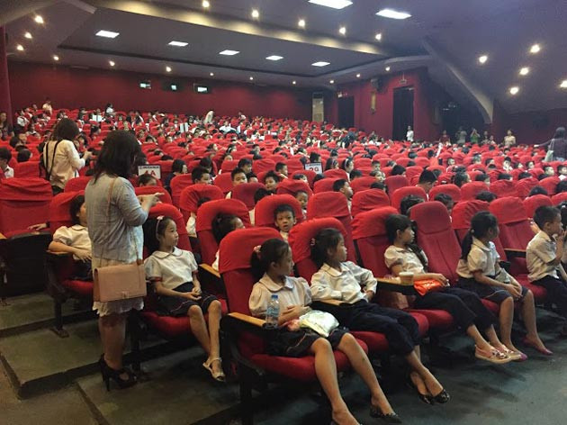 Học sinh trường Tiểu học Thăng Long xem phim tại rạp Tháng Tám, Hà Nội.