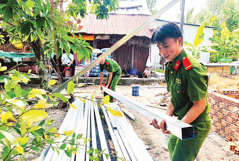 Hàng trăm đoàn viên, thanh niên tại các cơ sở đoàn trong lực lượng công an Kiên Giang đã trực tiếp hỗ trợ ngày công lao động, “3 cùng” (cùng ăn, cùng ở, cùng làm) với nhân dân từ thứ sáu đến chủ nhật hằng tuần. Các bạn trẻ tham gia nhiều phần việc như đắp nền nhà, chuyển gạch, trộn bê-tông, dựng nhà, lợp mái tôn, lát nền gạch… giúp người dân tiết kiệm chi phí xây dựng, nâng cao chất lượng công trình. Mỗi đoàn viên, thanh niên dành ra ít nhất ba ngày công lao động.