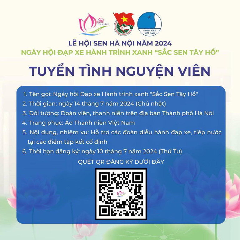 Ngoài ra, chương trình cũng tuyển 100 thanh niên, cả nam và nữ tham gia đạp xe Hành trình xanh “Sắc sen Tây Hồ”.