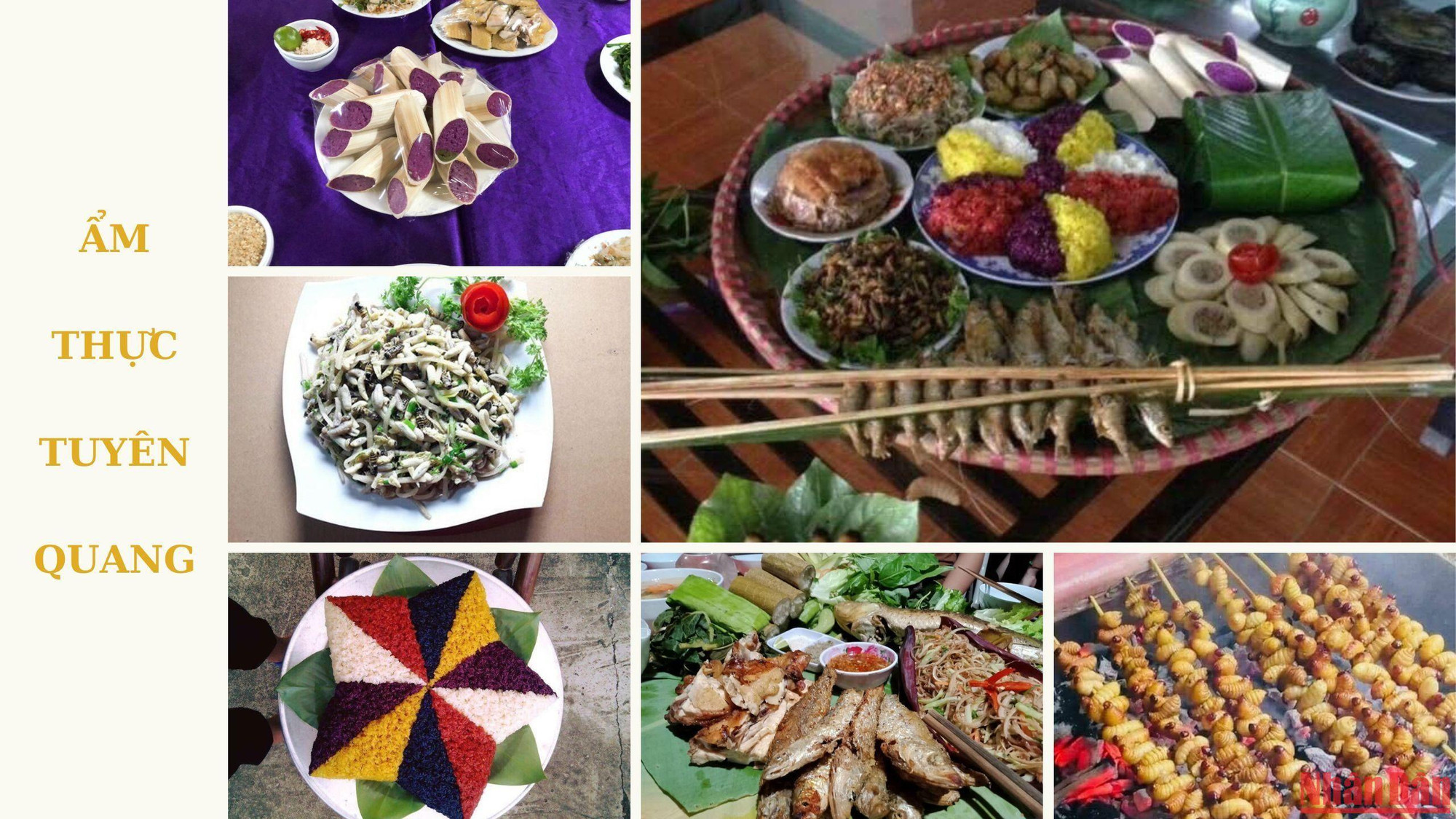 Những món ăn du khách không nên bỏ qua khi đến Tuyên Quang là cơm lam, gỏi cá bỗng sông Lô, thịt lợn muối chua, thịt lợn đen, bánh nếp nhân trứng kiến, bánh cuốn cà cuống, rượu ngô Na Hang... Các khách sạn, homestay ở Tuyên Quang đều có phục vụ ăn uống, món ăn theo thực đơn hoặc theo suất, giá trung bình 100.000-180.000 đồng/người. Ngoài ra, du khách cũng có thể đến thưởng thức ẩm thực xứ Tuyên tại các nhà hàng được thực khách đánh giá cao như: Nhà hàng Biển Rừng, Quán Thủy vịt, Lẩu Kin Kin, Quán ven hồ, Nhà hàng đầu bò…